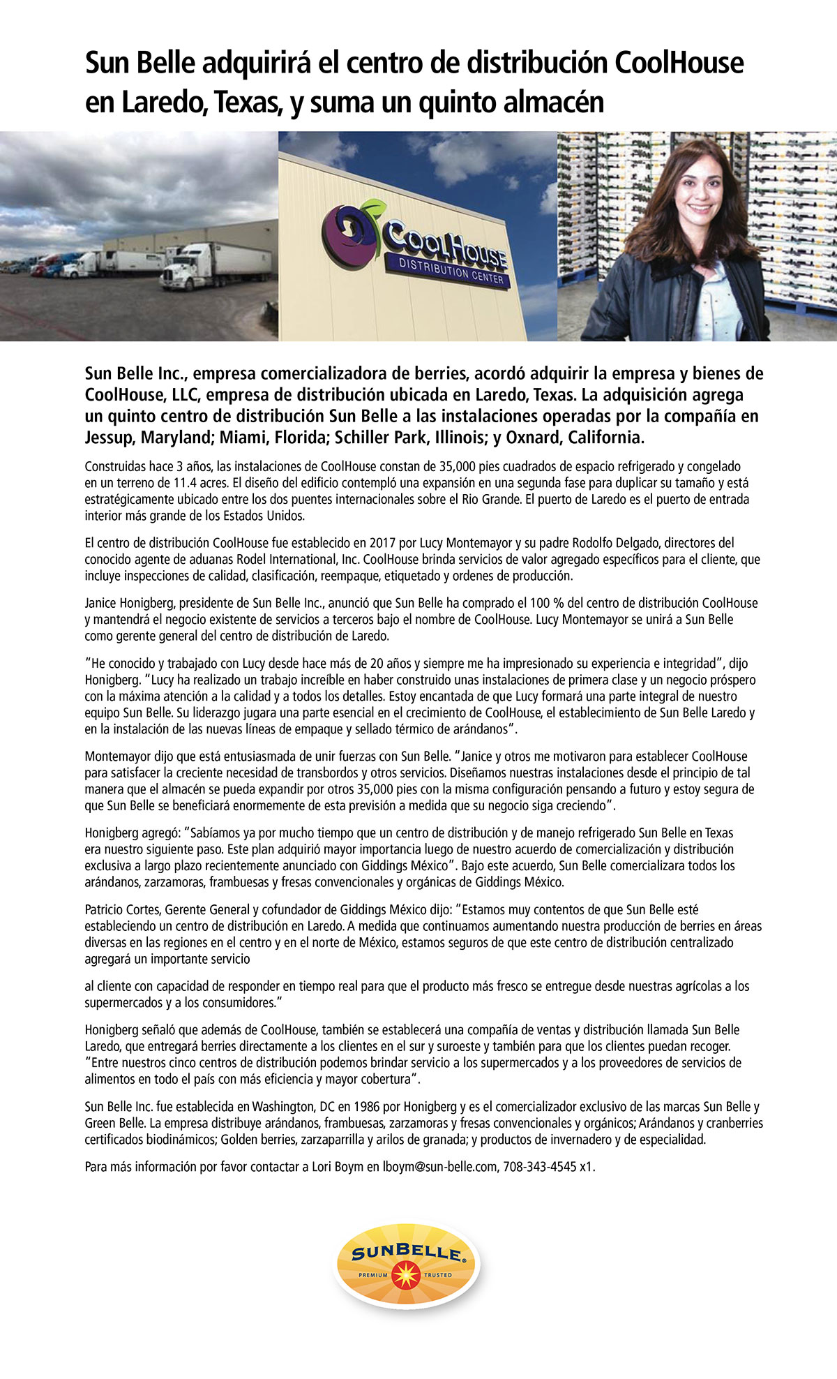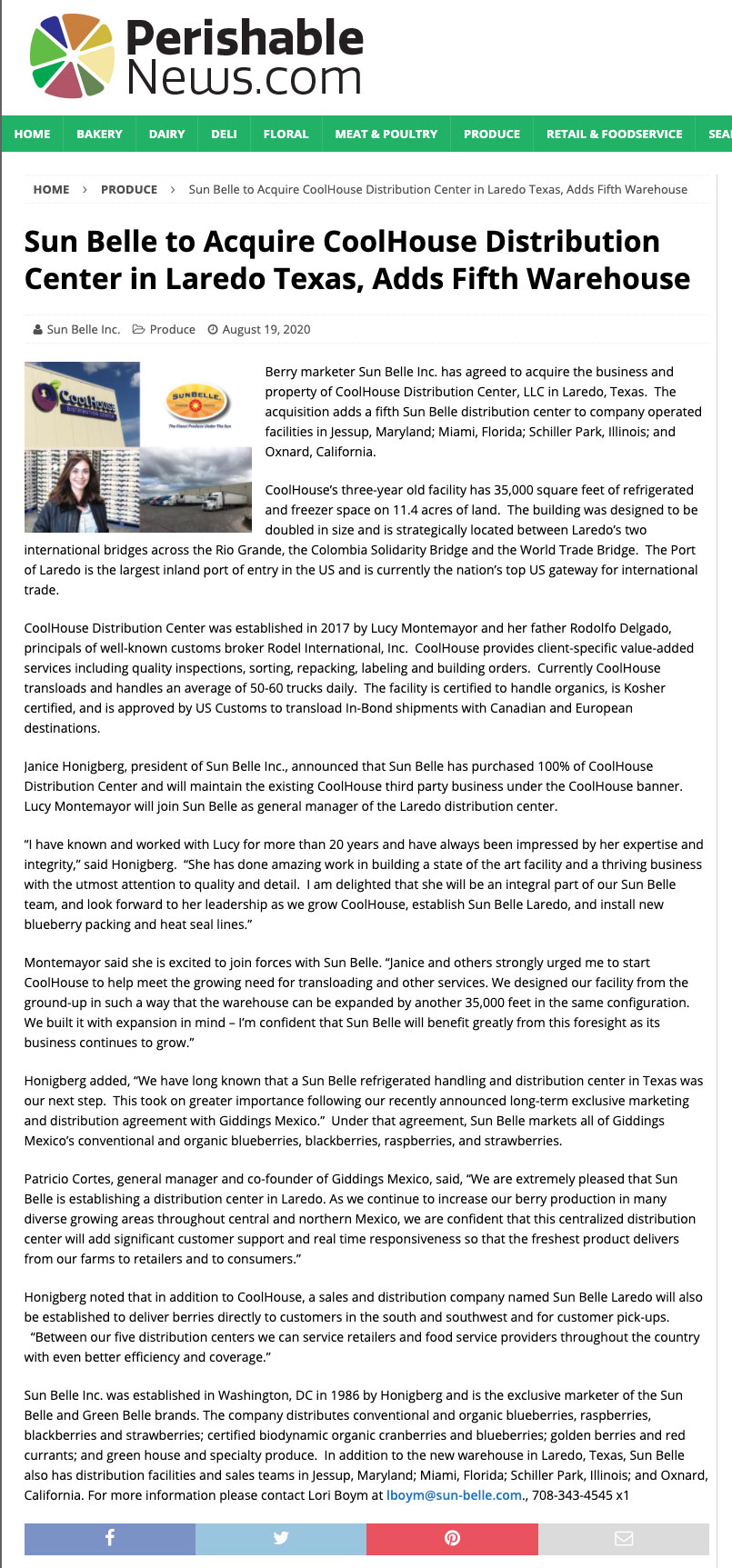 09/16/2020 - Sun Belle adquirirá el centro de distribución CoolHouse en Laredo, Texas, y suma un quinto almacén